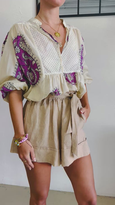 Hand On My Heart: Birdie Paisley Blouse x Timeless Polkadot . A celebration of heritage, artistry, and effortless style. The Birdie Paisley Blouse is beautifully paired back with our Timeless Polkadot—a soft contrast that brings playful sophistication to this vintage-inspired piece. The paisley print was originally hand-drawn in 1979 by Lakshmi, the founding artist behind our studio. Decades later, her work continues to breathe life into this collection, honouring a legacy of slow fashion, handcraft, and enduring beauty. Made from lightweight organic cotton voile, the Birdie blouse features a gathered neckline, billowing sleeves, shell buttons, and a gentle, feminine silhouette. When styled with the Timeless Polkadot, it strikes the perfect harmony between bold expression and timeless elegance.