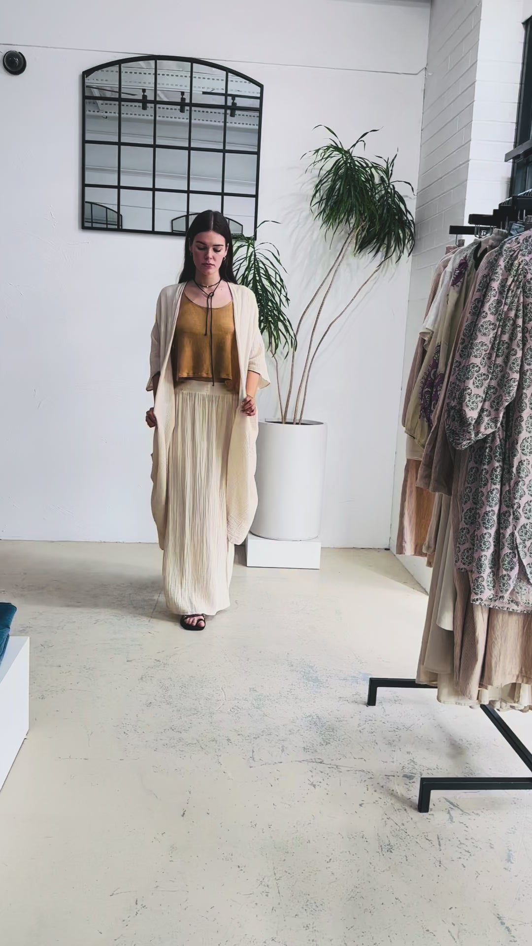 Discover understated luxury with our Nia Skirt, a timeless piece designed for movement, comfort, and quiet sophistication. Made from 100% Anatolian cotton, this long skirt features soft side splits and an elasticated waist for an easy, flattering fit that adapts to your shape and lifestyle. The silhouette is simple yet striking—flowing effortlessly with every step, while the breathable weave captures the laid-back beauty of the Aegean coast.
