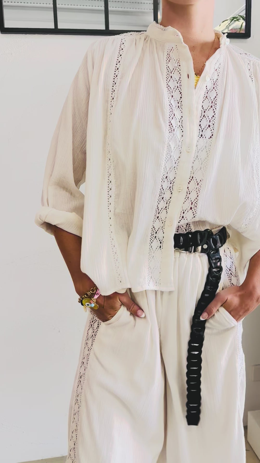 Luxe Lace Palazzo Pant - Hand On My Heart Our Luxe Lace Palazzo Pant is a timeless expression of elegance and ease. Now reimagined in handwoven organic cotton, this ethically crafted wide-leg silhouette drapes beautifully with a soft, breathable structure that flatters every figure. A delicate cotton lace trim runs down the side panel — an ode to feminine detail and artisan craft. The gathered elastic waist is finished with a soft cotton drawstring, offering both comfort and adjustability. Discreet side pockets add function without interrupting the fluid lines of the design. Soft to the touch and gentle on the earth, the Luxe Lace Palazzo is made entirely from natural fibres. It’s a relaxed yet refined staple, designed for barefoot days, breezy evenings, and effortlessly elegant escapes.