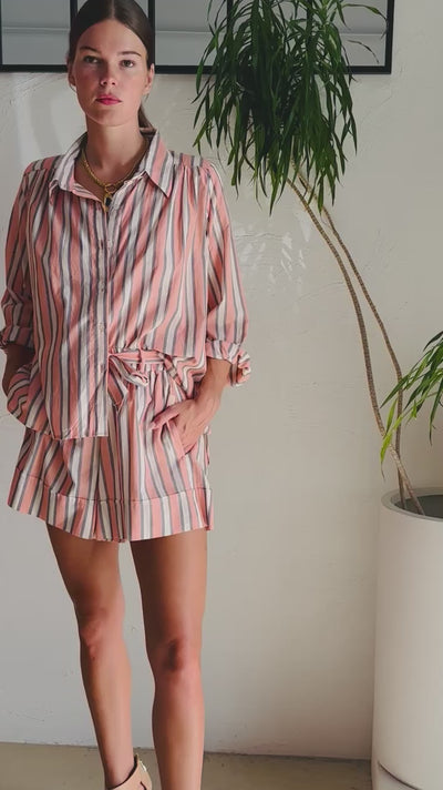 Hand On My Heart :Stripe Birdie Short is a Artisan hand woven light weight cotton. The short features side pockets, elastic wide gathered waistband for maximum comfort a self-fabric belt and wide cuff hem detail. With the adjustability of the gathered waist this short can be worn high or low waisted, there is fullness through the leg, so it sits loosely against the thighs to ensure a very flattering silhouette. Add a touch of Resort-wear luxury and elegant bohemian design to any occasion with the Stripe Birdie Organic Cotton Shorts