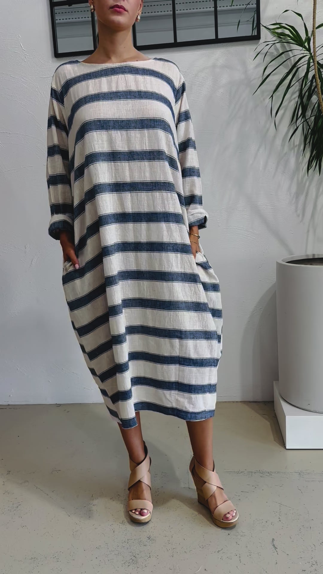 Hand On My Heart :Marrakech Stripe Tulip Gown in Blue and white stripe is Ethically made, in light weight organic cotton voile. The fabric is hand-loomed by artisans-every piece is truly unique. The dress is lightweight, ankle length with tapered hem, Shell button through key hole placket , side seam pockets, concealed internal French seams. The styling allows you to wear it loose like a caftan or belt it to give a more defined waist perfect for your next Vacation. Add a touch of Resort-wear luxury and elegant bohemian design to any occasion with this beautiful gown.