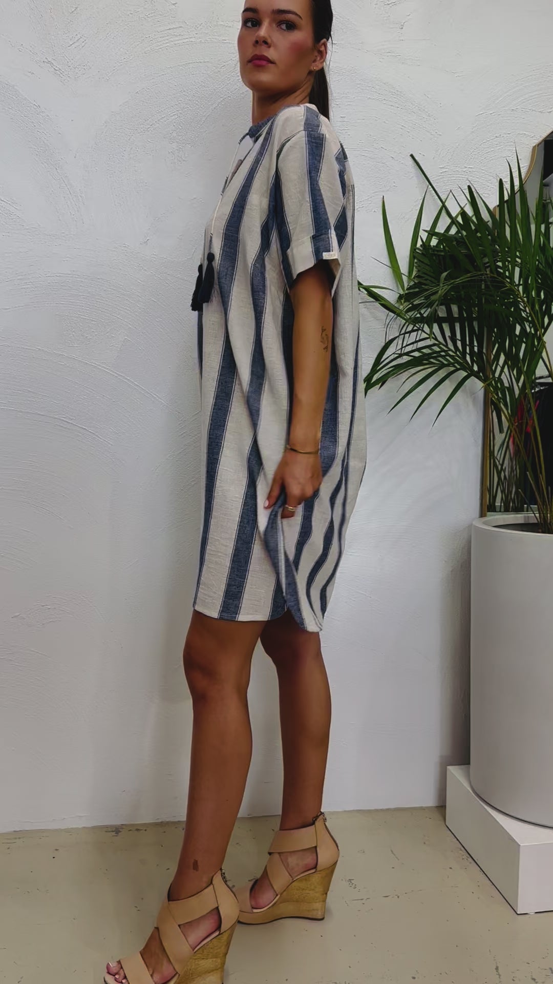 Hand On My Heart:Marrakech Stripe Holiday Dress in Blue and White Stripe is Ethically made, in textured organic cotton. The fabric is hand-loomed by artisans so every piece is truly unique. The Dress is lightweight, loose fitting free size , inspired buy the classic caftan with a twist so you can wear it as a dress loose or french tucked into jeans.