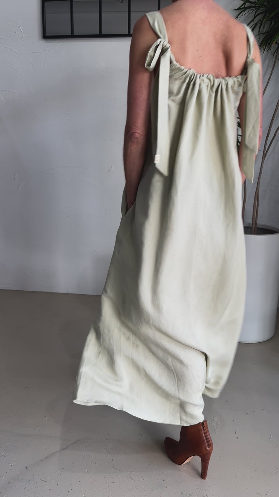 Hand On My Heart: Rapture Dress in Mint is Ethically made, in beautiful natural fibre linen. Featuring adjustable draw string back strap detail which allows an ease of fitting and styling. The top straps can be tied to be fully adjustable also, beautifully constructed with concealed internal French seams and a loose swing fit. It is Midi Length and offers ease and versatility in styling. Add a touch of Resort-wear luxury and elegant bohemian design to any occasion with this beautiful top.