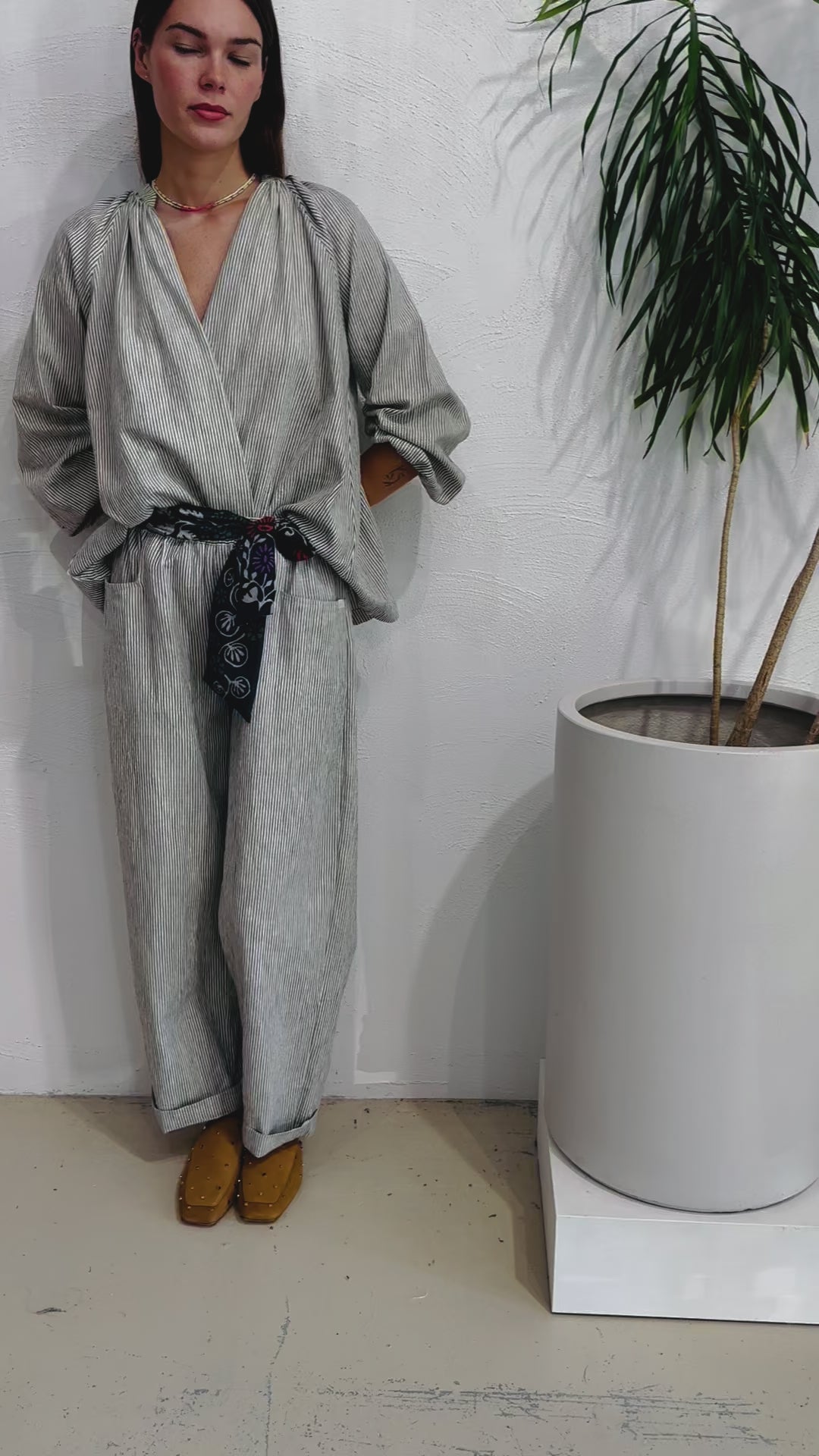Hand On My Heart :Blue Pin Stripe Organic Cotton Blouse is an Ethically made Blouse /light weight Jacket Featuring a beautiful hand loomed textured cotton stripe. The fabric is artisan made and sustainably sourced using only Natural Fibres. Add a touch of Resort-wear luxury and elegant bohemian design to your next vacation with the Blue and cream stripe Nile Blouse . Wear it open, layered , french tucked or cross wrapped.