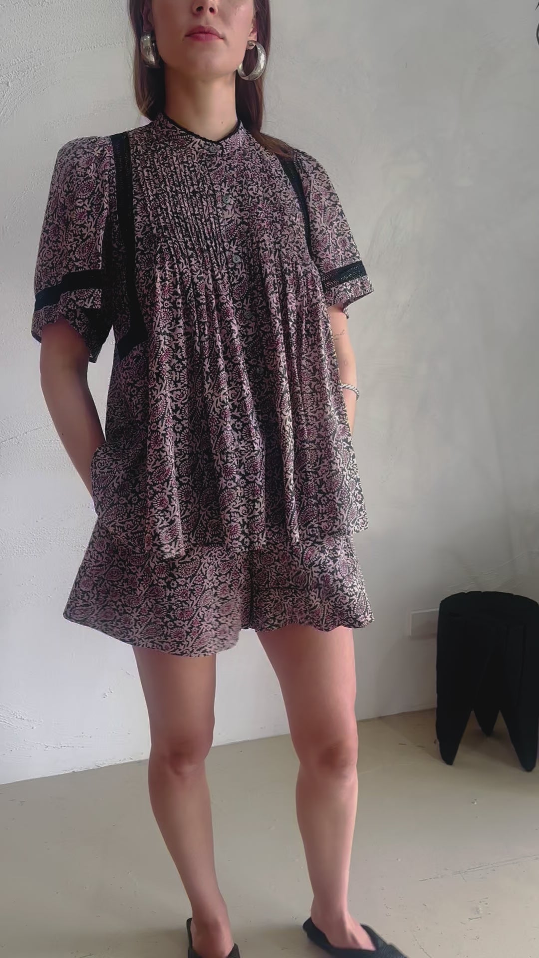 Hand On My Heart: Shadow Paisley Blouse in Dusty Lilac is Ethically made, in lightweight organic cotton voile.A beautiful short flutter sleeve blouse, Featuring a pin-tucked front yoke and delicate cotton lace. The blouse is buttoned though and looks great loose or tucked in. Beautiful Vintage Hand Drawn 1970’s Paisley Indian block print. The print is artisan-made; each colour is hand mixed and each motif is hand pressed-so every piece is truly unique.
