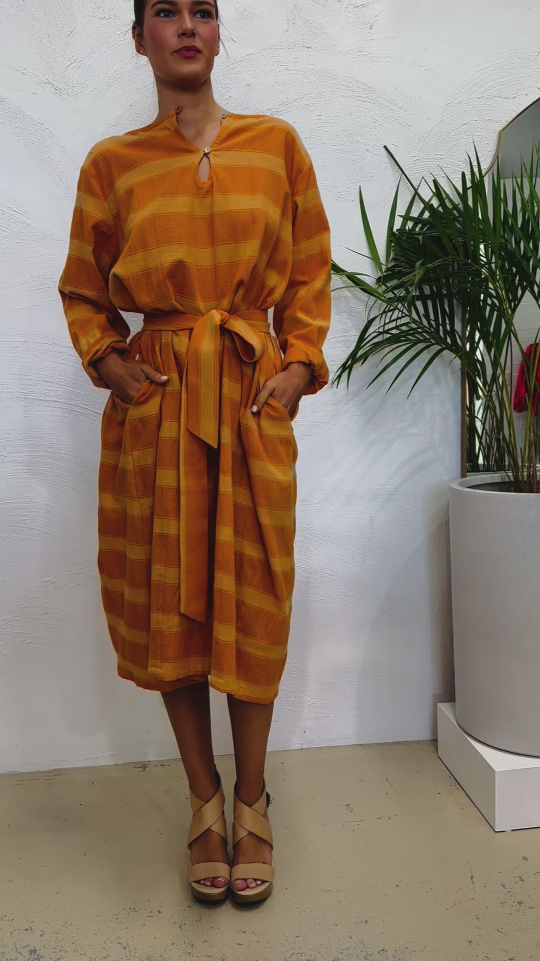 Hand On My Heart :Sunset Stripe Tulip Gown in a Ombre stripe is Ethically made, in light weight organic cotton voile. The fabric is hand loomed by artisans-every piece is truly unique. The dress is lightweight, ankle length with tapered hem, Shell button through key hole placket , side seam pockets, concealed internal French seams. The styling allows you to wear it loose like a caftan and also reverse it. Add a touch of Resort-wear luxury and elegant bohemian design to any occasion with this beautiful gown.